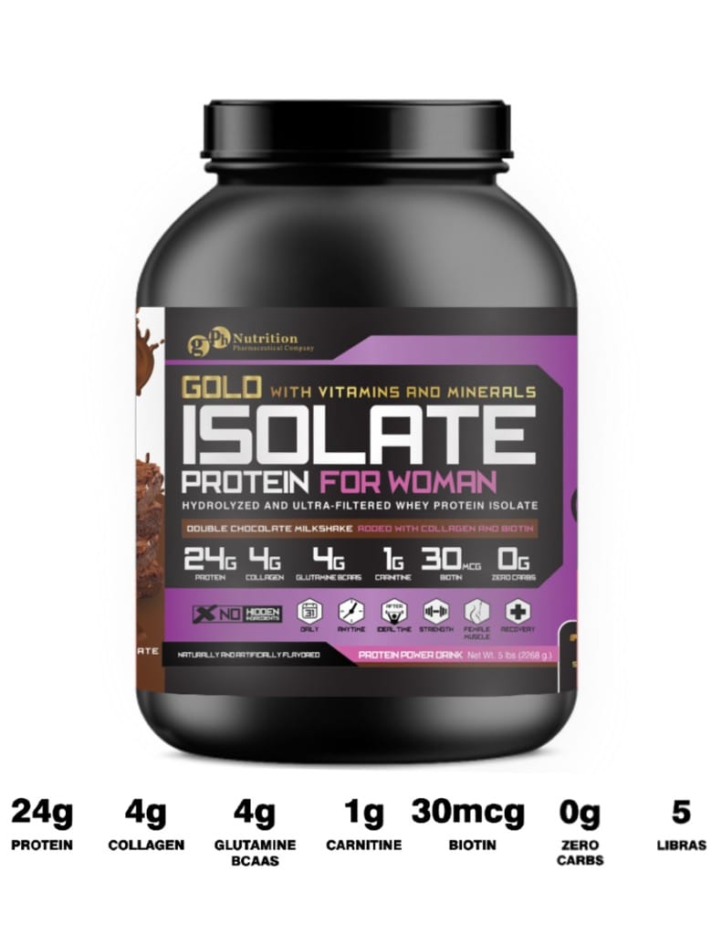 La proteína GOLD ISOLATE FOR WOMEN está adicionada con Proteína (24g) Ayuda a el desarrollar y mantener la masa muscular, Colágeno (4g) Promover la mejoría en la elasticidad de la piel y ayudar en la recuperación de la pérdida de cartílago, Carnitina (1g) transportar los ácidos grasos hacia el interior de las mitocondrias -orgánulo celular que se encarga de suministrar la energía necesaria para la actividad celular, Biotina (30 mcg) ayuda a convertir los carbohidratos, las grasas y las proteínas que consume en energía.